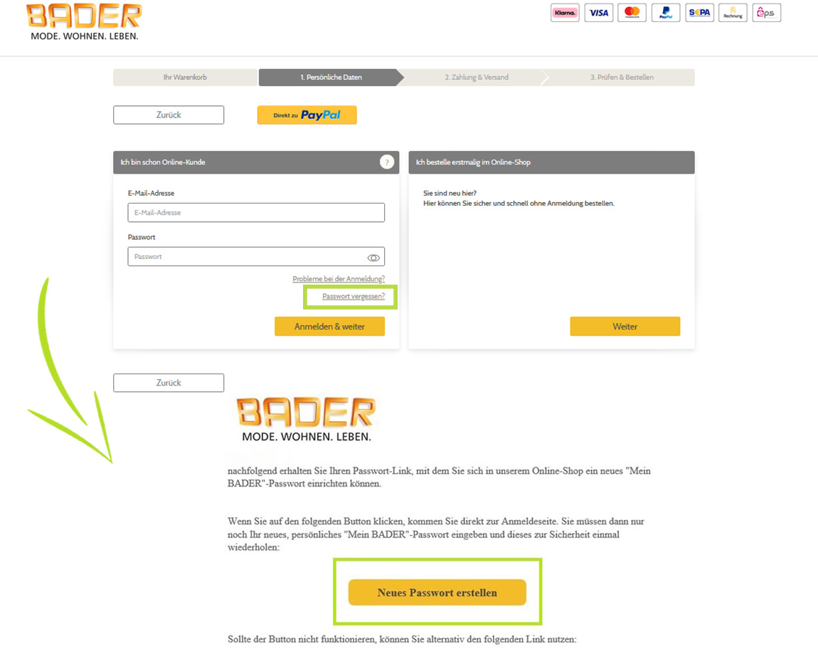 Sie finden überall dort, wo Sie ein Passwort benötigen, z. B. während des Bestellprozesses oder im "Mein BADER"-Bereich den Hinweis „Passwort vergessen?“. Klicken Sie einfach auf "Passwort vergessen?" und geben Sie im sich nun öffnenden Fenster Ihre E-Mail-Adresse ein. Sie erhalten unmittelbar danach von uns eine E-Mail, in der Sie einen Link zur Änderung Ihres Passwortes finden. Klicken Sie bitte auf diesen Link, um die Seite aufzurufen. Nun können Sie ein neues Passwort für Ihr Kundenkonto vergeben. Ihr altes Passwort verliert erst seine Gültigkeit, wenn Sie ein neues Passwort eingegeben haben.