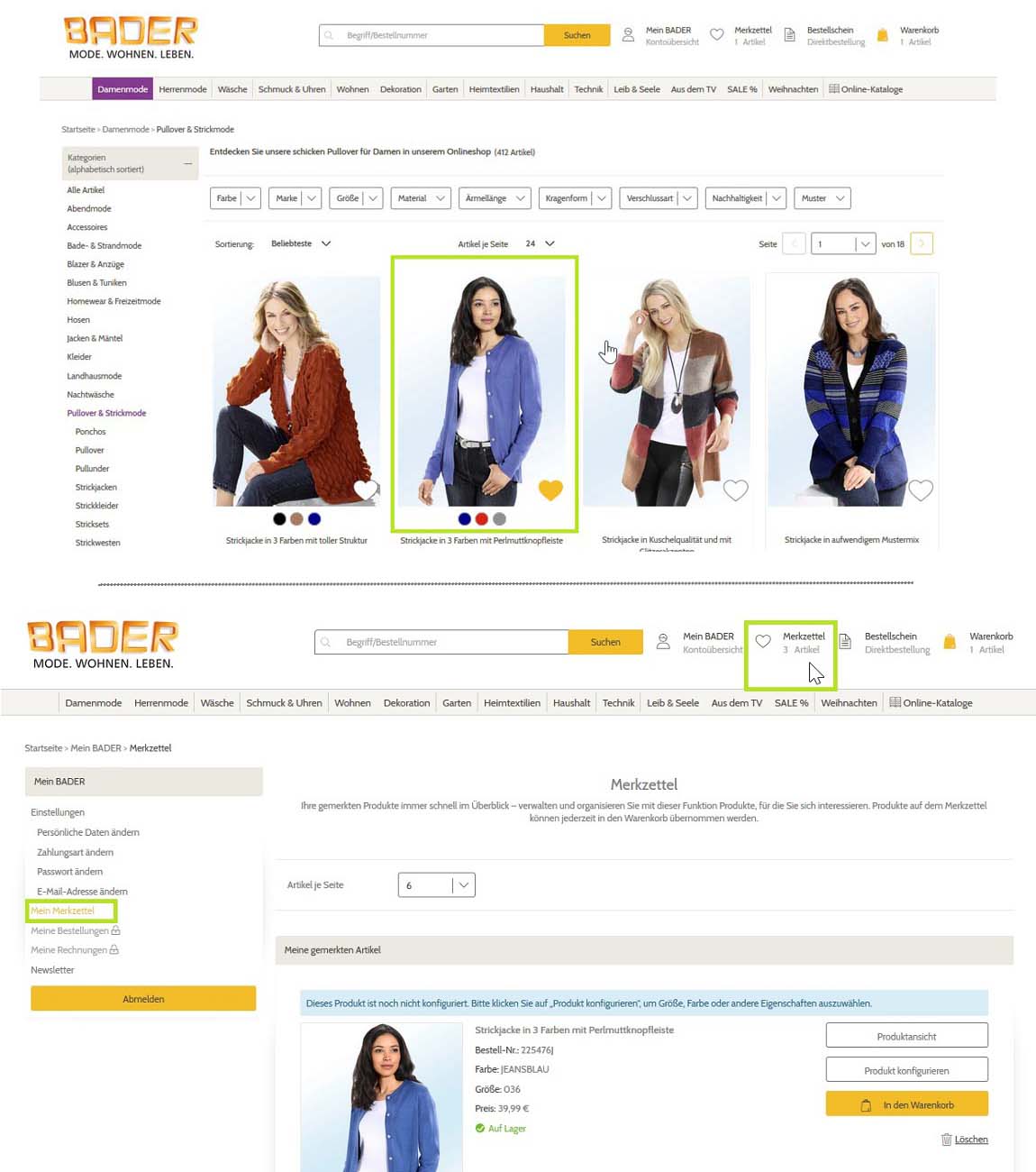 Ja, ähnlich dem Zurücklegen im Ladengeschäft, können Sie auch online Artikel bequem für später speichern. Um einen Artikel auf Ihrem Merkzettel zu notieren, ist es wichtig, dass Sie bei "Mein BADER" angemeldet sind. Um Artikel zu speichern, stehen Ihnen zwei Möglichkeiten zu Auswahl. Wenn Sie sich in der Übersicht einer Übersichtsseite befinden, z.B. im Bereich "Jacken und Mäntel", können Sie Ihren Wunschartikel per Klick auf das Herz-Symbol speichern. Die Herzen sind jeweils unten rechts auf den Artikelabbildungen platziert. Befinden Sie sich bereits auf der Produktdetailseite, können Sie auch auf das Herz-Symbol (rechts neben dem Warenkorb-Button) klicken. Sobald Sie auf das Herz geklickt haben, färbt sich dieses gelb und der Artikel wird automatisch auf Ihrem Merkzettel notiert.