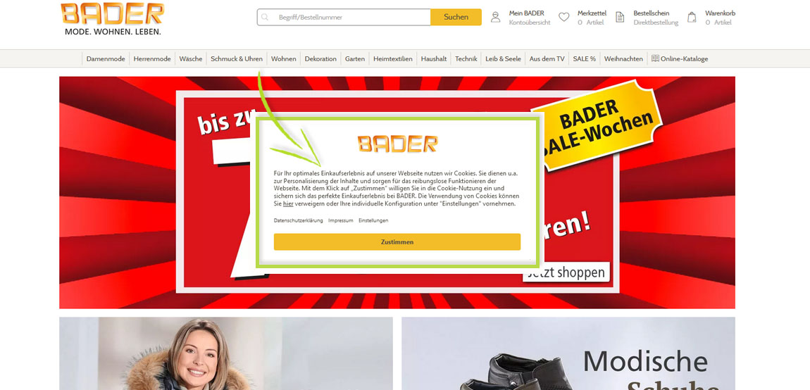 Für Ihr optimales Einkaufserlebnis auf unserer Webseite nutzen wir Cookies. Sie dienen u.a. zur Personalisierung der Inhalte und sorgen für das reibungslose Funktionieren der Webseite. Mit dem Klick auf „Zustimmen“ willigen Sie in die Cookie-Nutzung ein und sichern sich das perfekte Einkaufserlebnis bei BADER. Die Verwendung von Cookies können Sie hier verweigern oder Ihre individuelle Konfiguration unter "Einstellungen" vornehmen. Weitere Details zur Cookie Nutzung können Sie auch unseren Datenschutzbestimmungen entnehmen.