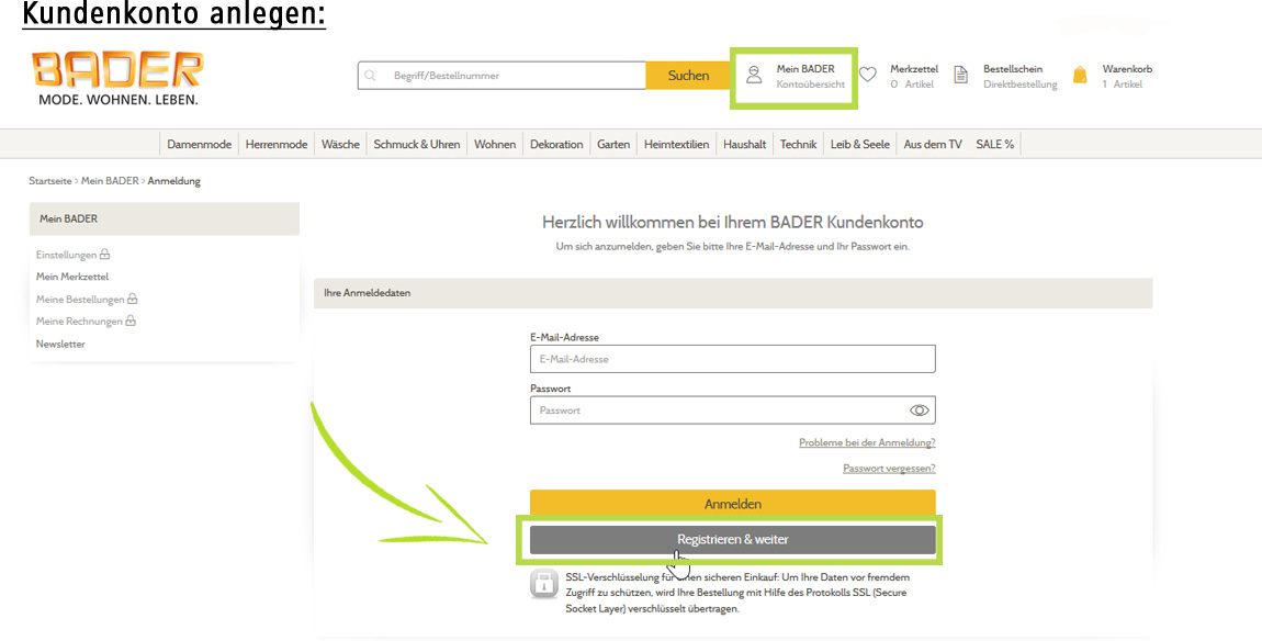 Vor Ihrer ersten Online-Bestellung auf bader.de haben Sie die Möglichkeit Ihr persönliches Kundenkonto zu erstellen. Dazu klicken Sie bitte im oberen Bereich der Startseite auf den Link "Mein BADER" und anschließend im Anmeldebereich auf den Link "Registrieren & weiter". Dort können Sie ein Formular ausfüllen.