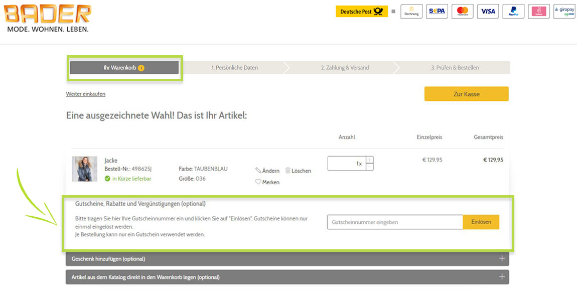 Wenn Sie alle gewünschten Artikel in den Warenkorb gelegt haben, können Sie Ihre Bestellung nun abschließen. Dies erfolgt in wenigen Schritten: Ihren Warenkorb erreichen Sie rechts oben durch einen Klick auf das Feld „Warenkorb“. Im Warenkorb haben Sie die Möglichkeit alle ausgewählten Artikel nochmals zu überprüfen und ggf. anzupassen. Möchten Sie Ihre Bestellung abschließen, klicken Sie auf "Zur Kasse". Wenn Sie bereits Online-Kunde sind und ein "Mein BADER" Konto haben, können Sie sich einfach mit Ihrer E-Mail-Adresse und Ihrem Passwort anmelden. Sofern Sie erstmalig im Online-Shop bestellen können Sie ganz bequem Ihre persönlichen Daten eingeben und ohne Registrierung Ihre Bestellung abschließen.