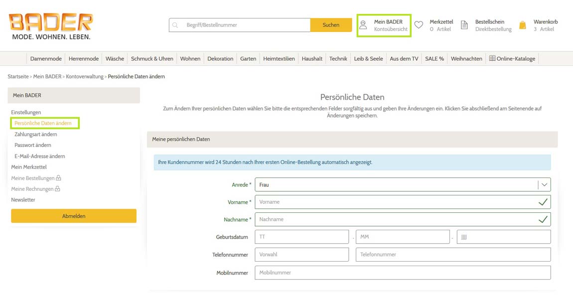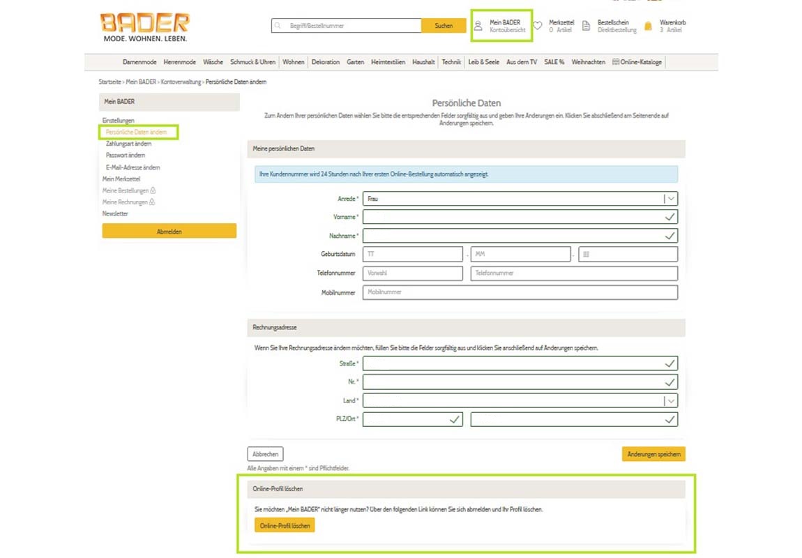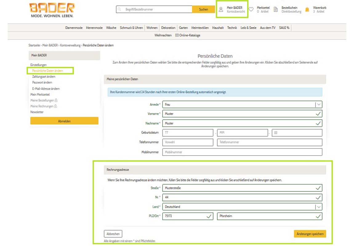 Ihre „Persönliche Daten“ können Sie im Rahmen einer Bestellung ändern. Ändern Sie Ihre Anschrift einfach unter "Mein BADER" / "Einstellungen" / "Persönliche Daten ändern" und speichern Sie die Adresse neu ab. In Folge Ihrer anschließenden Bestellung werden uns Ihre neuen Kontaktdaten übermittelt.