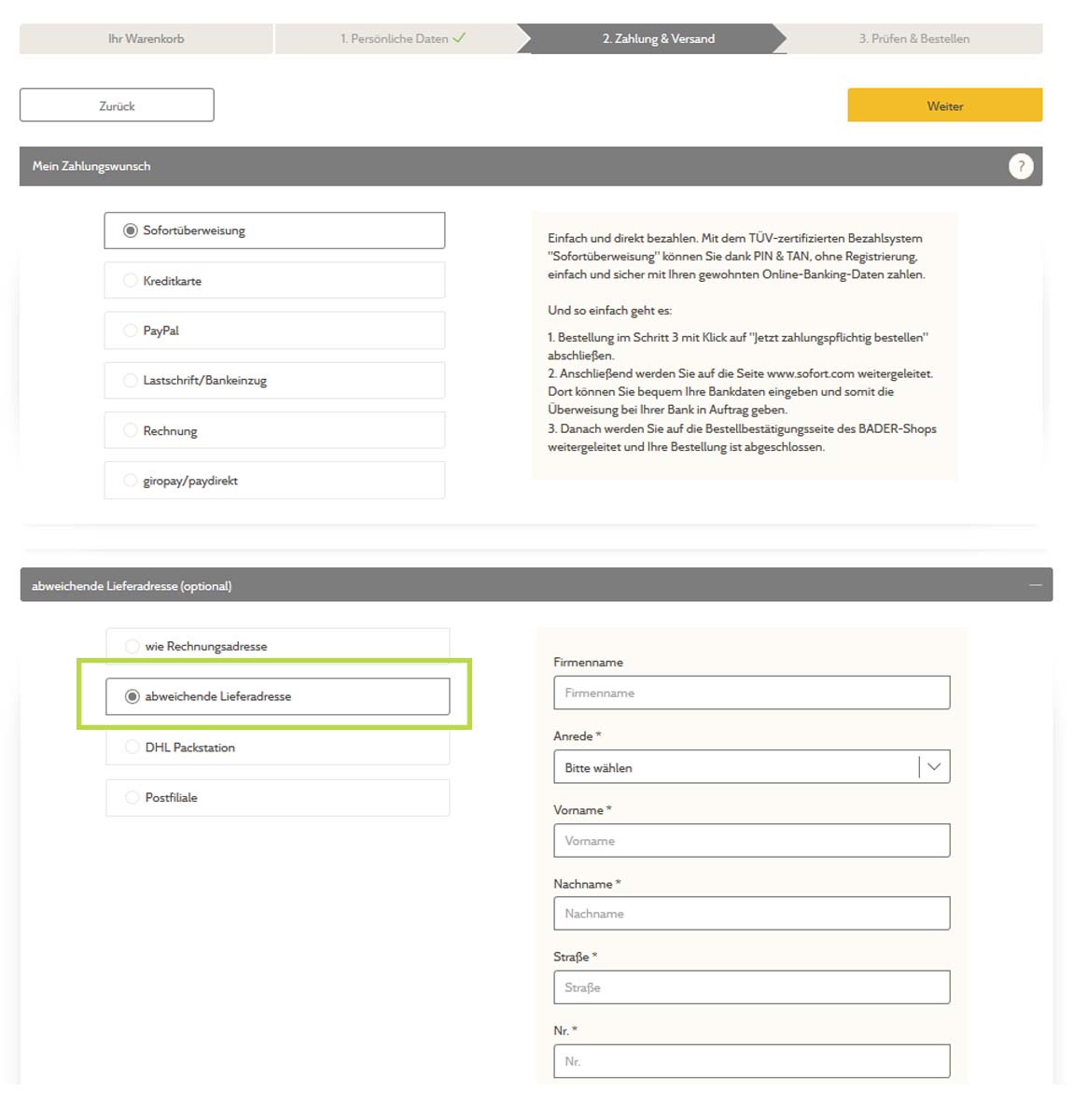 Während des Registrierungsvorgangs bei "Mein BADER" geben Sie unter anderem auch Ihre Adresse an. Diese ist bei einer Bestellung gleichzeitig als Rechnungs- und Lieferadresse gespeichert. Wenn Sie Ihre Bestellung an eine abweichende Lieferadresse senden lassen möchten, können Sie unter "2. Zahlung & Versand" (nach "Ihr Warenkorb“ / "1. Persönliche Daten“) eine abweichende Lieferadresse angeben.