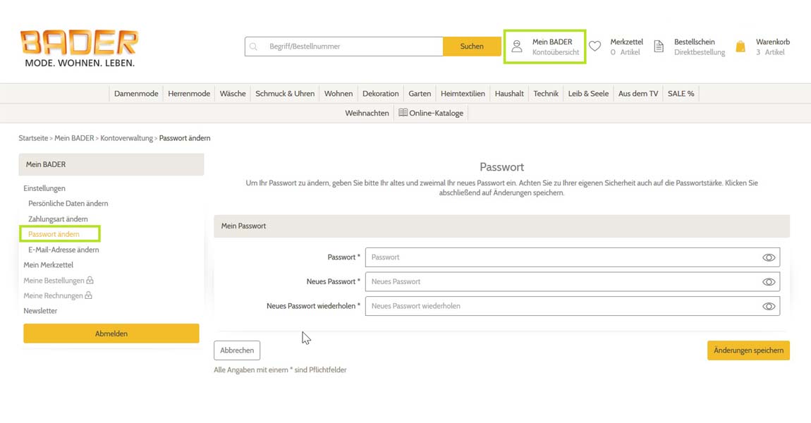 Melden Sie sich im oberen Bereich der Startseite unter "Mein BADER" mit Ihrer hinterlegten E-Mail-Adresse und Ihrem Passwort an. Unter der Überschrift "Meine persönlichen Daten" können Sie Ihr "Passwort ändern". Klicken Sie dazu auf den jeweiligen Link.