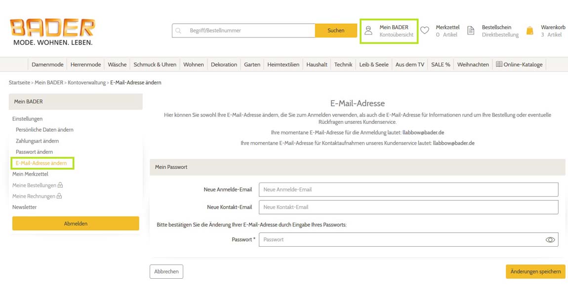 Melden Sie sich im oberen Bereich der Startseite unter "Mein BADER" mit Ihrer hinterlegten E-Mail-Adresse und Ihrem Passwort an. Unter der Überschrift "Meine persönlichen Daten“ können Sie Ihre "E-Mail-Adresse ändern“. Klicken Sie dazu auf den jeweiligen Link.