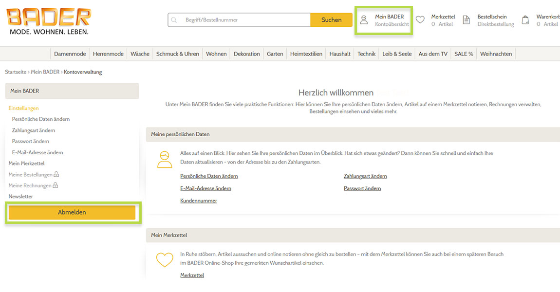 Oder in Ihrem "Mein BADER"-Kontobereich unter dem links stehenden Button "Abmelden" ausloggen.