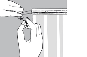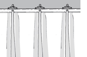 - Haben Sie ein Gardinen mit Faltenband, dann hängen Sie jeweils links und rechts neben der entstandenen Falte einen Roll- oder Cliphaken in die Bandschleife ein. So wird die Falte fixiert.